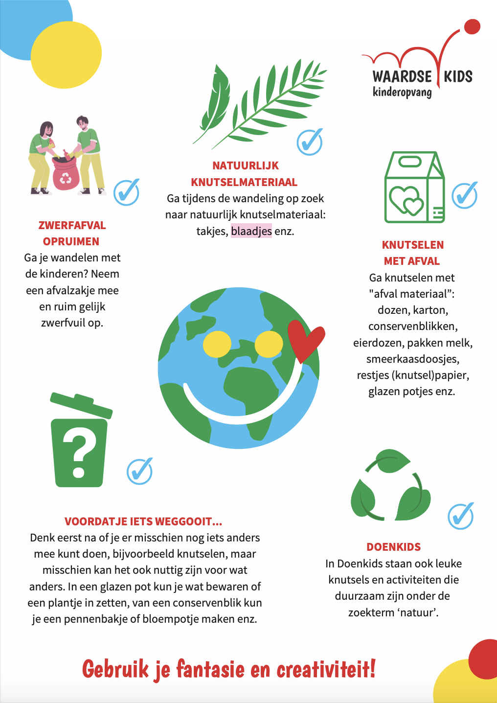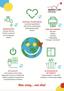 We ontwikkelden twee infographics. Eén beschrijft tips voor de werknemers die op de groep staan, wat je specifiek met kinderen aan duurzaamheid kunt doen. Deze infographic gaat voornamelijk over productgebruik en vermindering van afval en is getiteld: ‘Gebruik je fantasie en creativiteit!’’ De infographic ‘Wees zuinig… met alles!’’ geeft algemene tips voor iedereen op de locaties, zoals tips om energie te besparen.